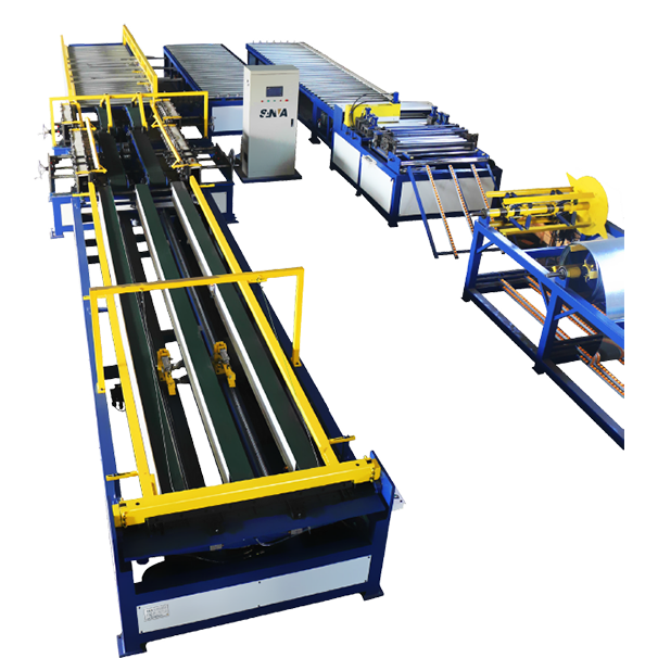 主要完成共板法兰和角钢法兰/"C"骨法兰的加工,日加工能力1000-2800平米,风管只需输入尺寸,生产线自动完成开卷、校平、压紧、冲角、联合咬口、直角咬口、共板法兰成型、角铁法兰成型/"C"骨法兰成型、折方成型